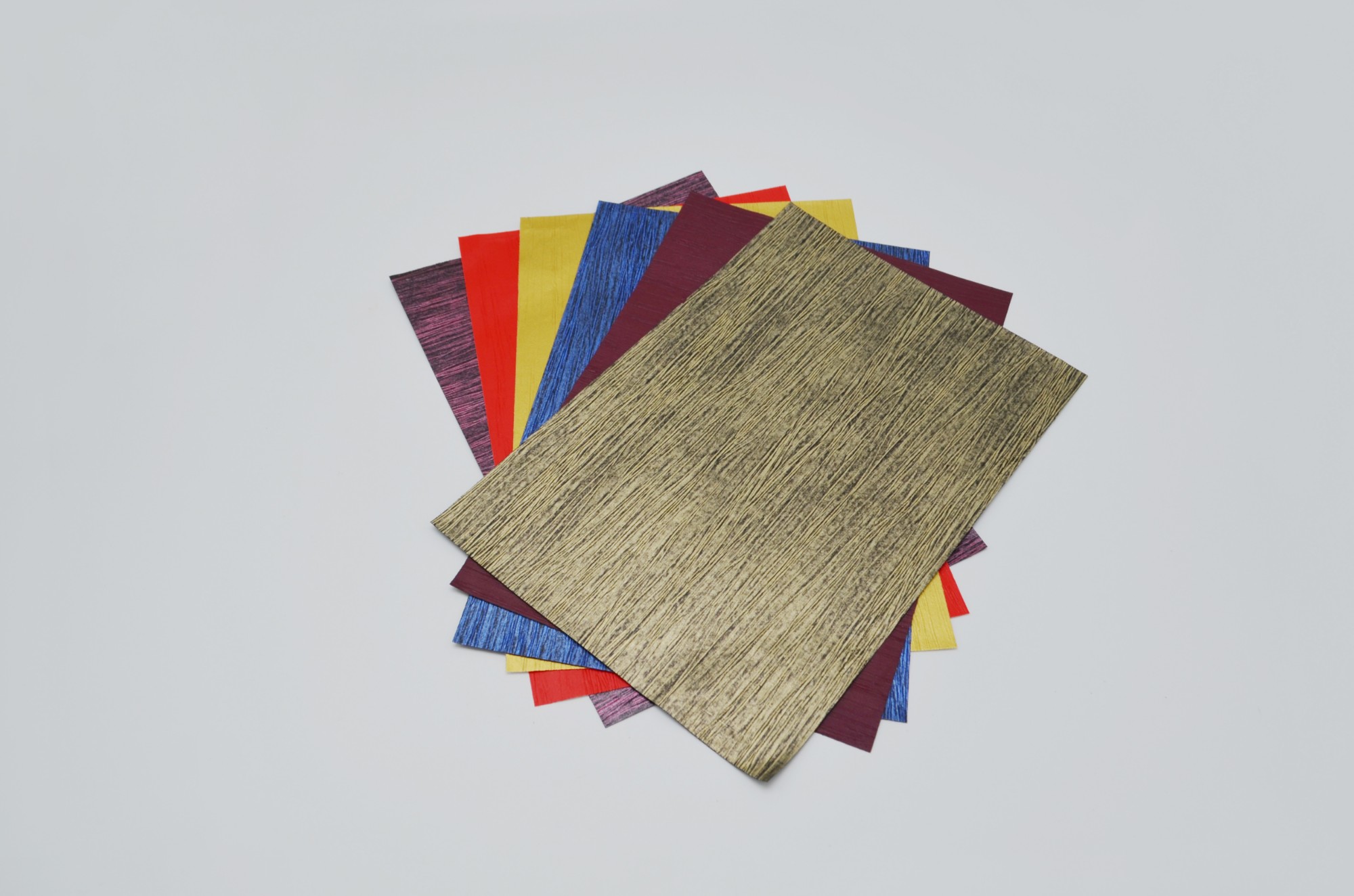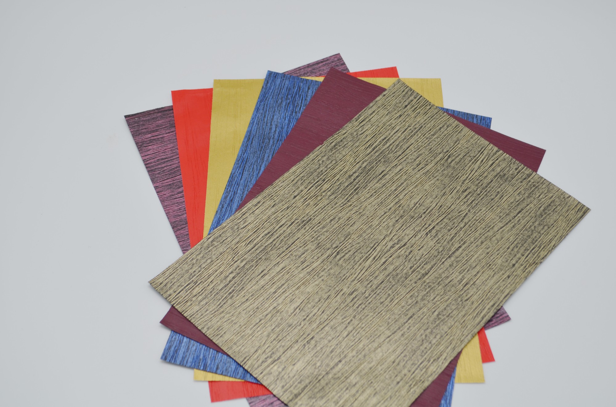 皱纹布纹——这款PU充皮纸的纹理替代了传统皱纹布,可单色可双色,金属质感强烈,环保,可降解。
